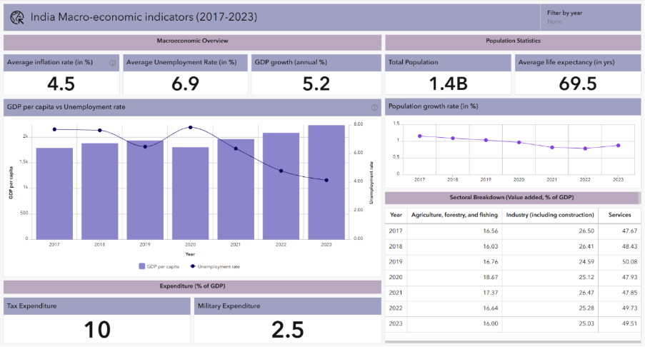 Im Dashboard India Economic Indicators erleichtern Diagramme mit zwei Achsen den Vergleich von Trends wie dem BIP-Wachstum und der Inflation. Dies trägt dazu bei, die Darstellung übersichtlicher zu gestalten und die analytische Klarheit zu verbessern.