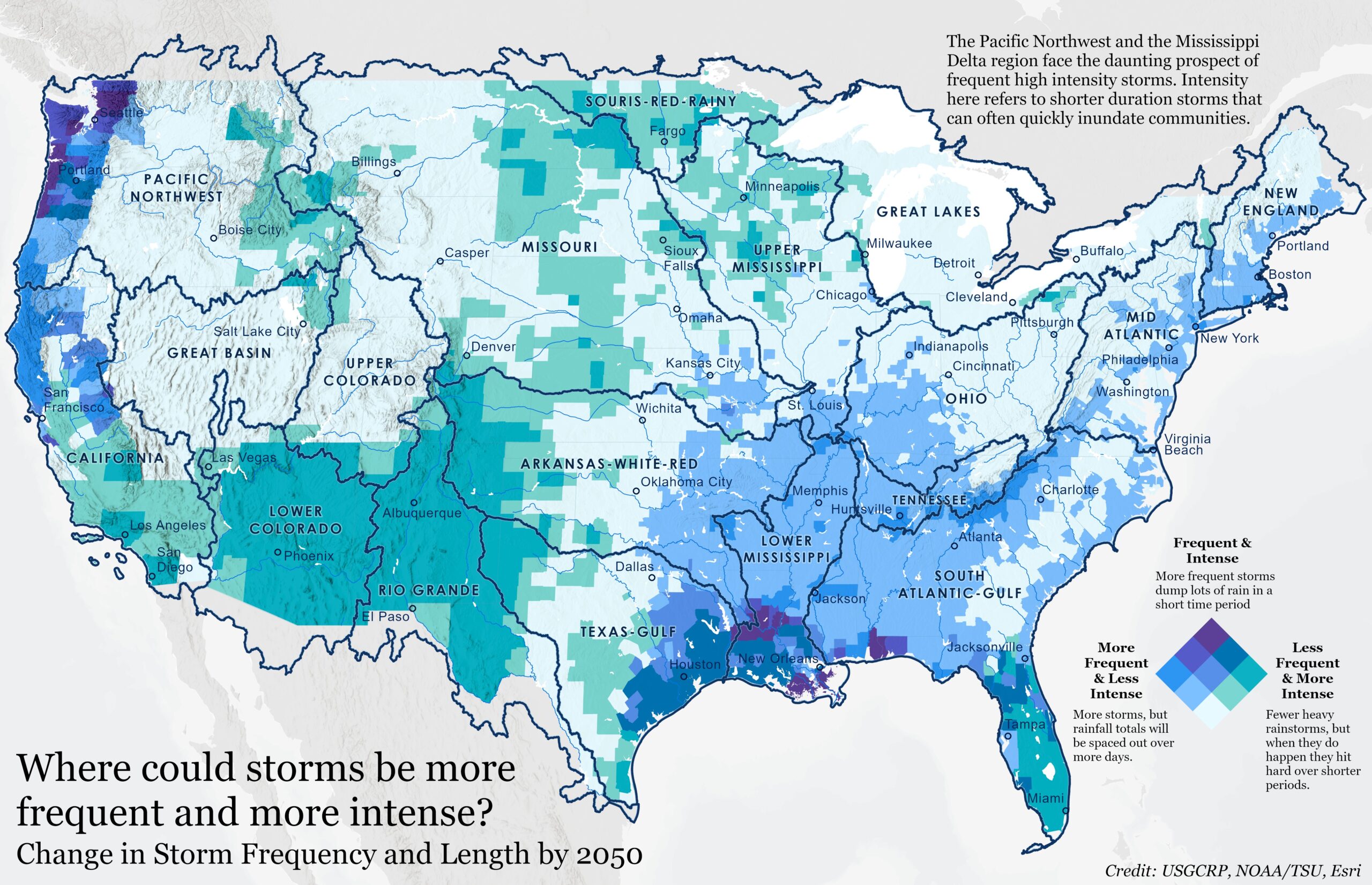 Die zweite Karte zur Häufigkeit und Dauer von Stürmen verwendet eine wasserinspirierte Farbpalette aus Blau-, Türkis- und Lilatönen, wobei gemischte Farben die Beziehung zwischen Sturmverhalten, Niederschlag und Überflutungsrisiko visuell verknüpfen. Mit zunehmender Häufigkeit und Intensität verschmelzen die Farben und vertiefen sich, sodass Bereiche mit überlappendem Risiko auf der Karte auf natürliche Weise hervortreten.
