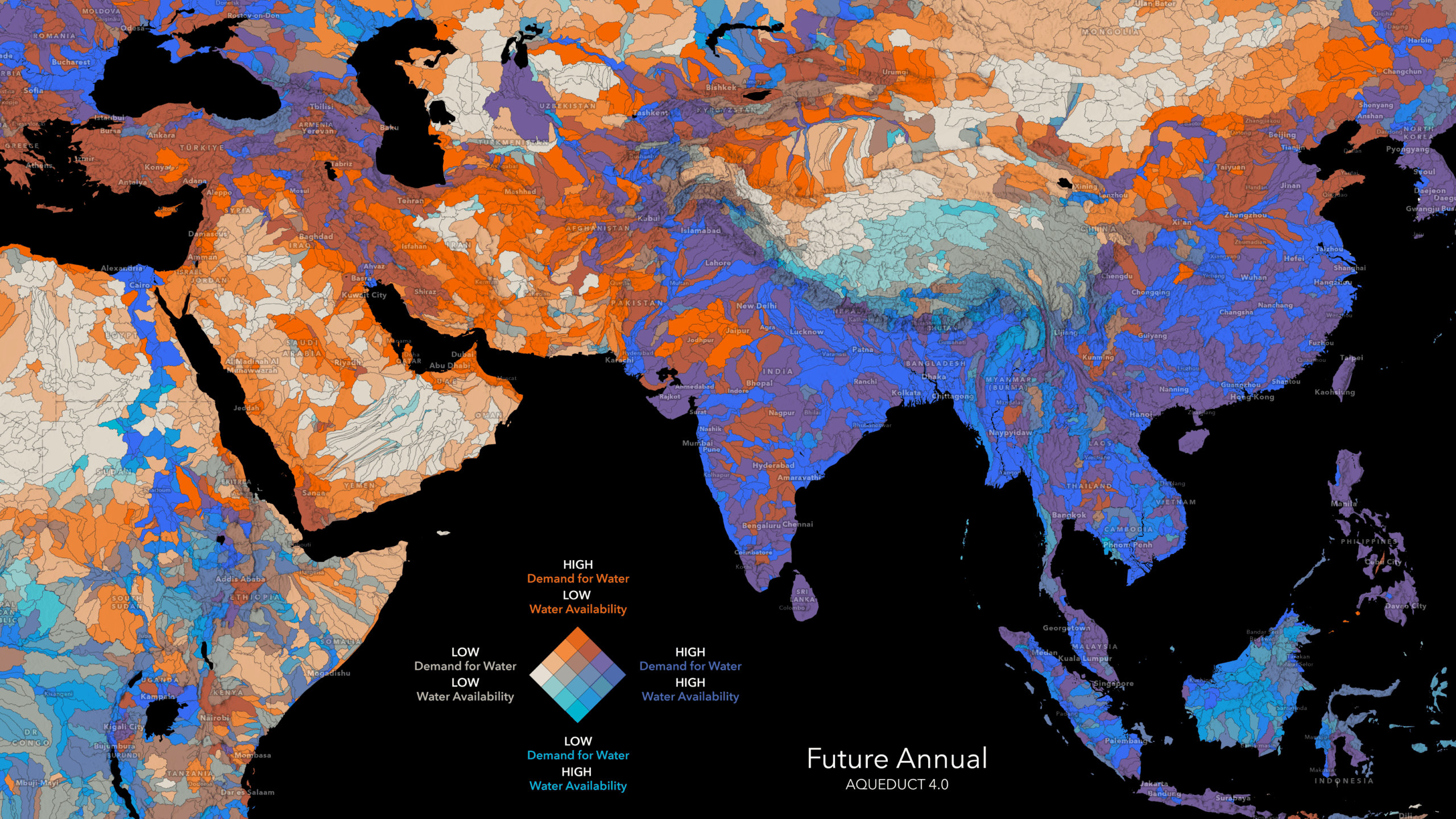 Die dritte bivariate Karte kombiniert den projizierten Brutto-Wasserbedarf mit der Verfügbarkeit von blauem Wasser, um zukünftigen Wassermangel sichtbar zu machen. Die Farbpalette setzt auf Kontraste: Orange hebt Gebiete hervor, in denen hoher Bedarf auf geringe Verfügbarkeit trifft, Lila kennzeichnet Regionen mit sowohl hohem Bedarf als auch reichlich Wasser, Hellblau zeigt niedrigeren Bedarf bei höherer Verfügbarkeit, und Beige markiert Gebiete mit vergleichsweise geringem Druck.