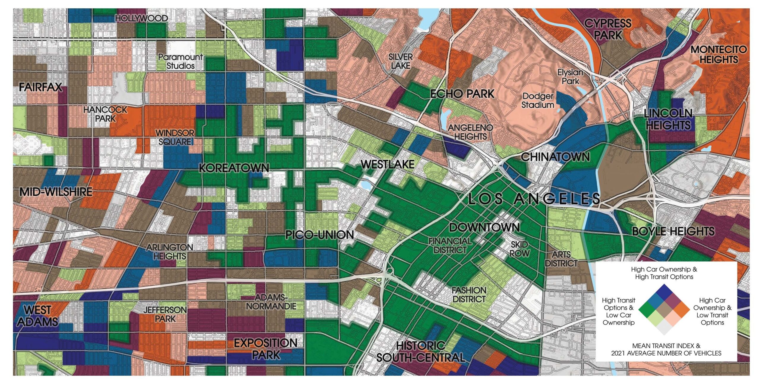 Die erste Karte von Los Angeles stammt aus Jack Dangermonds Buch The Power of Where und nutzt Farbsymbolik, um die Aussage zu unterstreichen. Grün steht für eine ökologisch orientierte Kombination aus hoher Erreichbarkeit durch öffentliche Verkehrsmittel und geringer Autonutzung, wodurch Downtown Los Angeles und Koreatown als fußgängerfreundliche, transitreiche Gebiete hervorgehoben werden. Orange symbolisiert Abgase und Umweltbelastung und zeigt Viertel mit höherem Autoverkehr und weniger Transitmöglichkeiten. Ziel der Karte war es, die Vorstellung eines durchgehend autozentrierten Los Angeles infrage zu stellen und stattdessen einen lebendigen urbanen Kern aufzuzeigen, der durch Transitfreundlichkeit und Fußgängerfreundlichkeit geprägt ist.