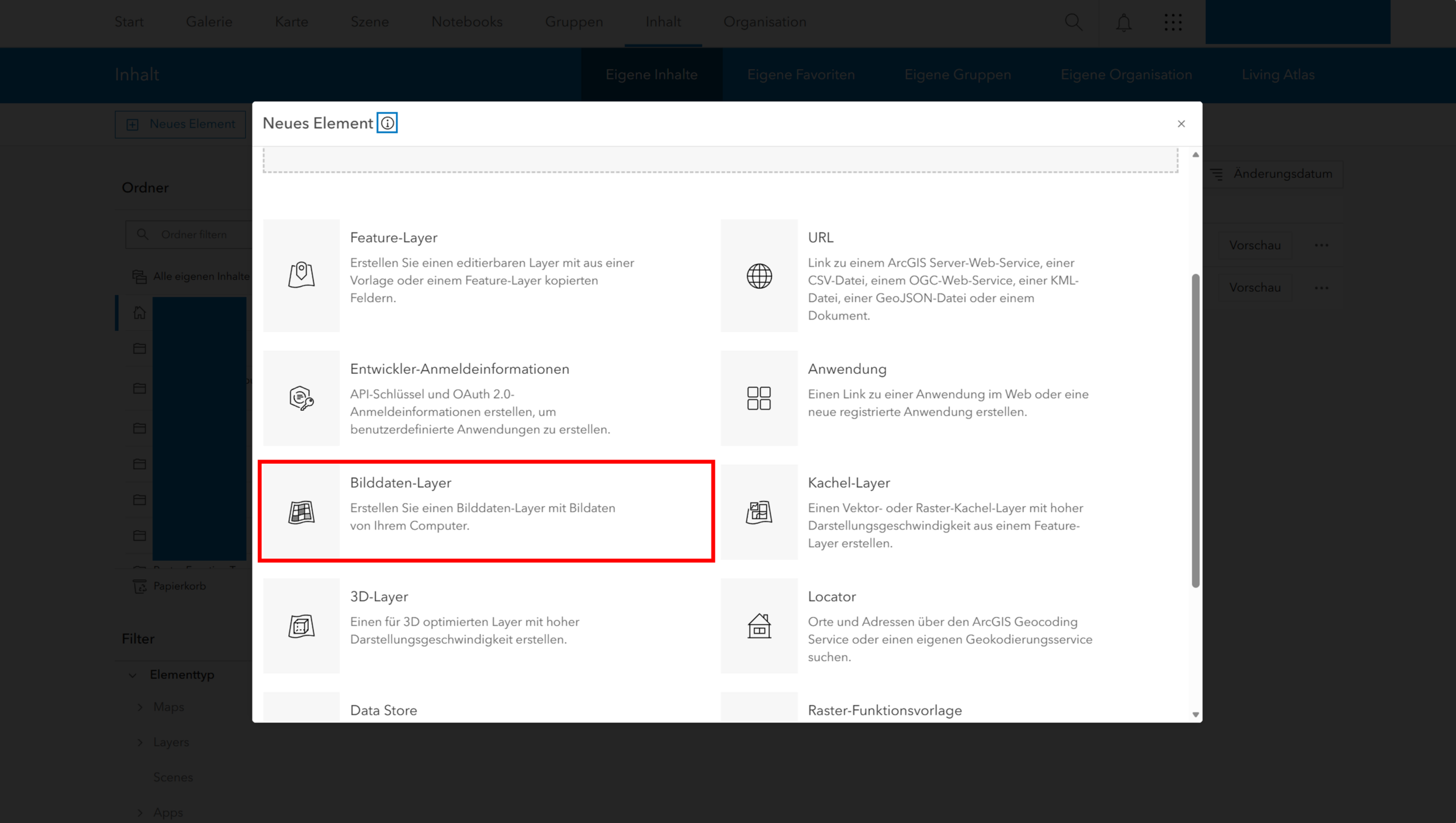 - Welche Datenformate kann ich hinzufügen? Eine Auswahl findet sich beim Klick auf Neues Element. Wir wollen für unseren mosaikierten Datensatz Bilddaten hochladen. Daher wählen wir hier Bilddaten-Layer aus.