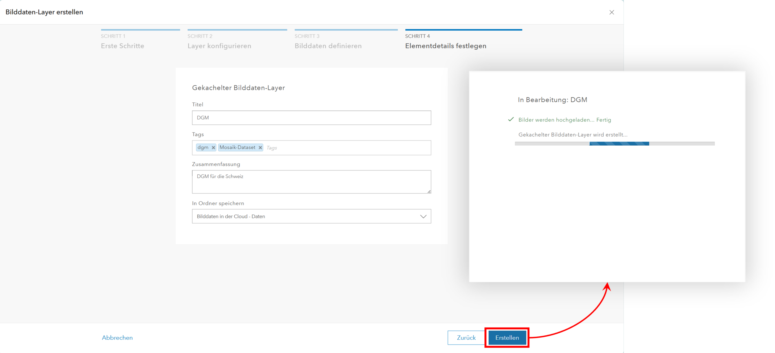- Hat man sich für eine Layer-Art entschieden, müssen die Daten hochgeladen werden. Hier kann man entweder per Drag & Drop Bilddaten einladen, oder über Durchsuchen die Daten im File System auswählen. Hier können außerdem bestimmte Eigenschaften des zu erstellenden Bilddatendienstes konfiguriert werden.